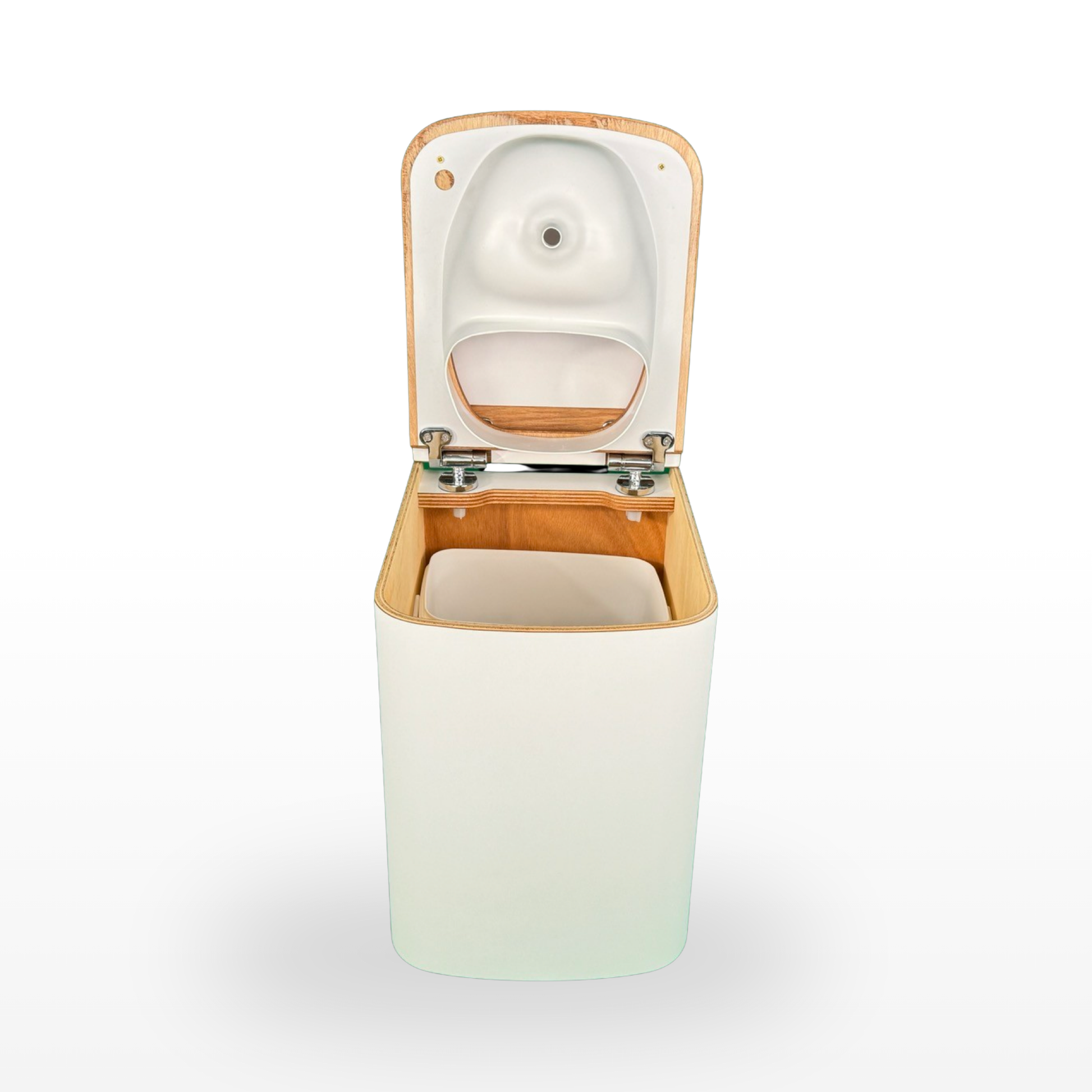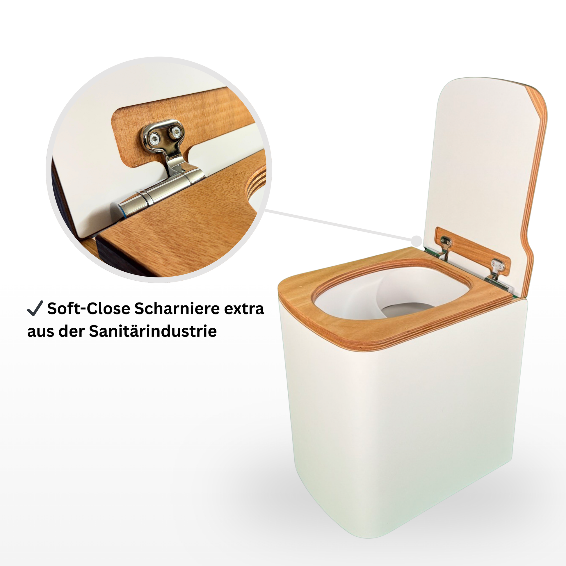 - Trockentrenntoilette aus Holz mit HPL Beschichtung - Trenneinsatz - Silikon-Geruchsverschluss - Urinkanister mit geschlossenem Deckel für den Transport des Urinkanisters (DN 96) - Feststoffeimer mit Deckel